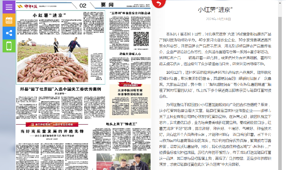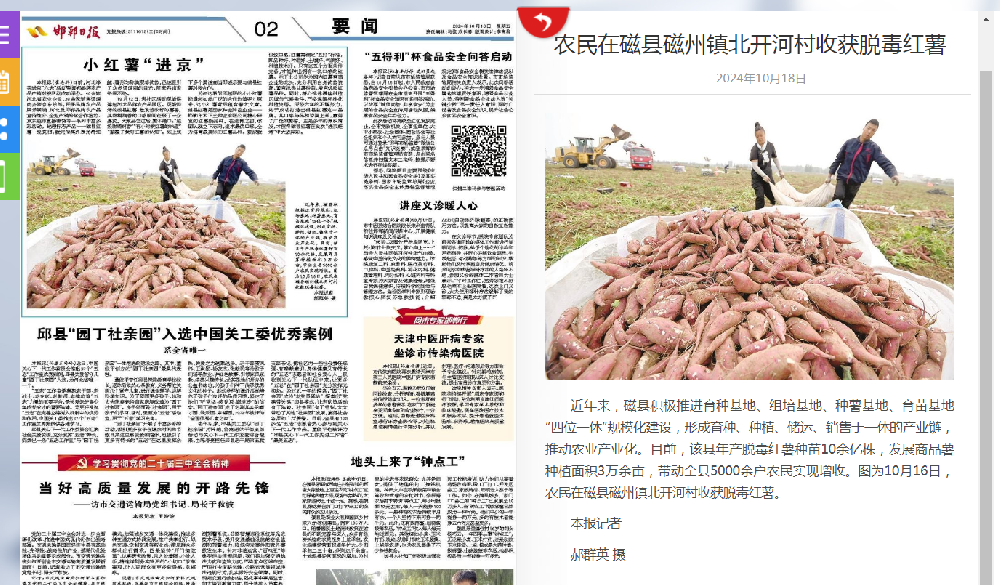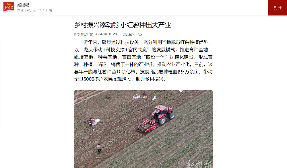 2024年10月16日,邯鄲日報社打造的平臺級移動客戶端“新邯鄲”,發(fā)布《鄉(xiāng)村振興添動能 小紅薯種出大產(chǎn)業(yè)》報道。該報道聚焦磁縣脫毒紅薯產(chǎn)業(yè),解析了磁縣這一地方特色產(chǎn)業(yè)的發(fā)展模式、規(guī)?;ㄔO及對社會經(jīng)濟的積極影響。