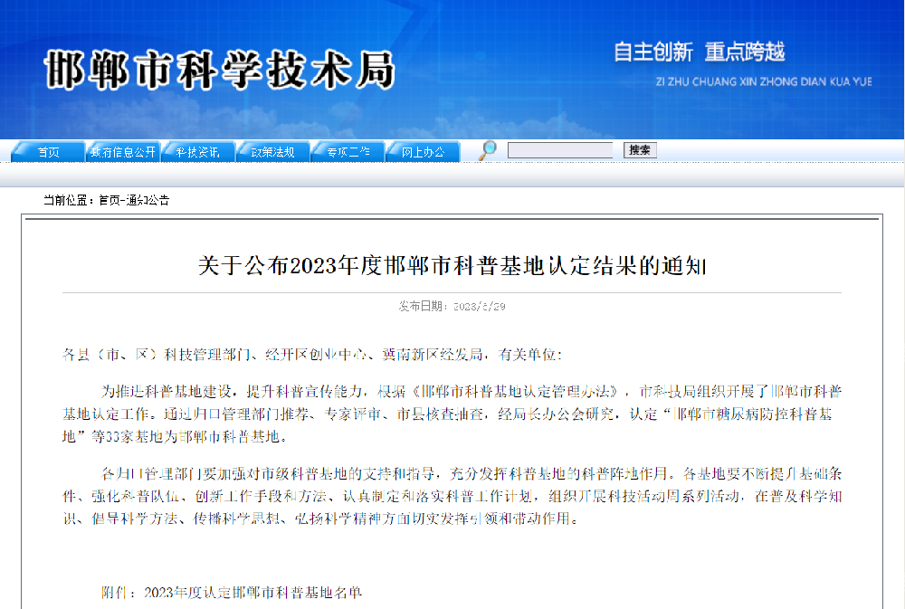 為推進(jìn)科普基地建設(shè),提升科普宣傳能力,根據(jù)《邯鄲市科普基地認(rèn)定管理辦法》,市科技局組織開(kāi)展了邯鄲市科普基地認(rèn)定工作。通過(guò)歸口管理部門推薦、專家評(píng)審、市縣核查抽查,經(jīng)局長(zhǎng)辦公會(huì)研究,認(rèn)定“邯鄲市脫毒甘薯科普基地”等33家基地為邯鄲市科普基地。