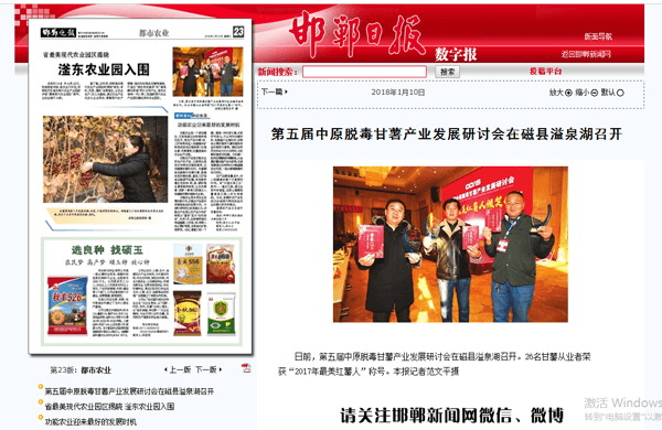 2018年1月8日,第五屆中原脫毒甘薯產(chǎn)業(yè)發(fā)展研討會在河北磁縣溢泉湖隆重舉行。得到各大報紙、網(wǎng)絡(luò)媒體的關(guān)注。本次研討會特別邀請國家甘薯產(chǎn)業(yè)技術(shù)體系首席專家馬代夫、山東省煙臺市農(nóng)科院甘薯研究所所長、煙薯25育種人辛國勝、河北省農(nóng)林科學(xué)院糧油作物研究所主任馬志民、龍薯9號育種人楊立明,及來自國內(nèi)24個省市的優(yōu)秀甘薯種植戶、育苗單位、農(nóng)資企業(yè)、機(jī)械廠家、甘薯加工、銷售企業(yè)代表共300余人出席參加。為國內(nèi)甘薯企業(yè)、種植戶在種苗培育、品種選擇、安全生產(chǎn)、貯藏銷售、精深加工、產(chǎn)業(yè)合作等方面創(chuàng)新了發(fā)展新思路,為進(jìn)一步加快脫毒甘薯產(chǎn)業(yè)化推廣,推動中國脫毒甘薯產(chǎn)業(yè)的健康發(fā)展發(fā)揮了重要的作用。