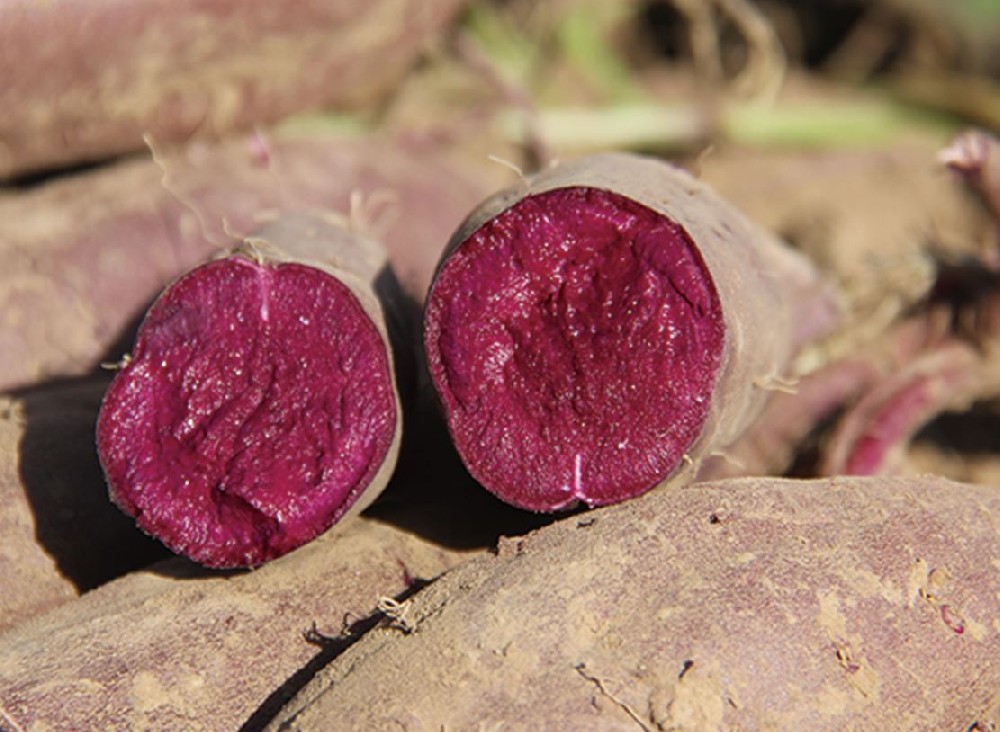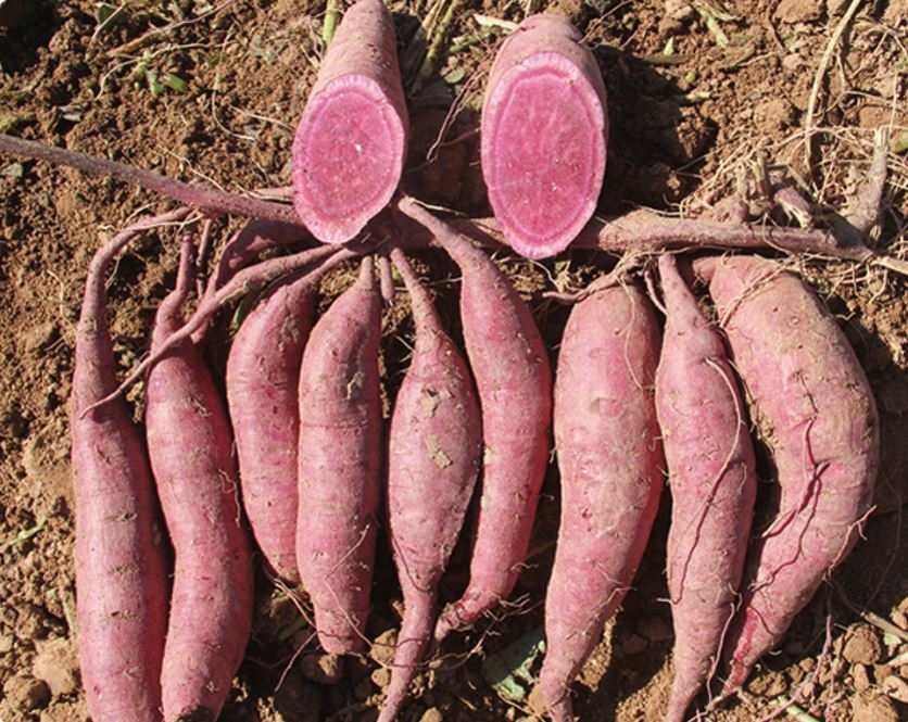 鮮食型甘薯品種,中長薯,數(shù)塊條形,薯皮紫紅色,薯肉紫色,結(jié)薯集中整齊,干物率33.44%,鮮薯花青素含量為20.46mg/100g。抗甘薯蔓割病、根腐病、黑斑病,耐儲存性好。一般畝產(chǎn)鮮薯2000公斤左右。