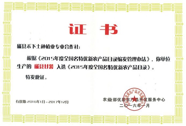 2016年1月,根據(jù)《2015年度全國名特優(yōu)新農(nóng)產(chǎn)品目錄編發(fā)管理辦法》,由磁縣禾下土種植業(yè)專業(yè)合作社申報的"磁縣甘薯"經(jīng)農(nóng)業(yè)部優(yōu)質(zhì)農(nóng)產(chǎn)品開發(fā)服務(wù)中心評定,正式入選《2015年度全國名特優(yōu)新農(nóng)產(chǎn)品目錄。