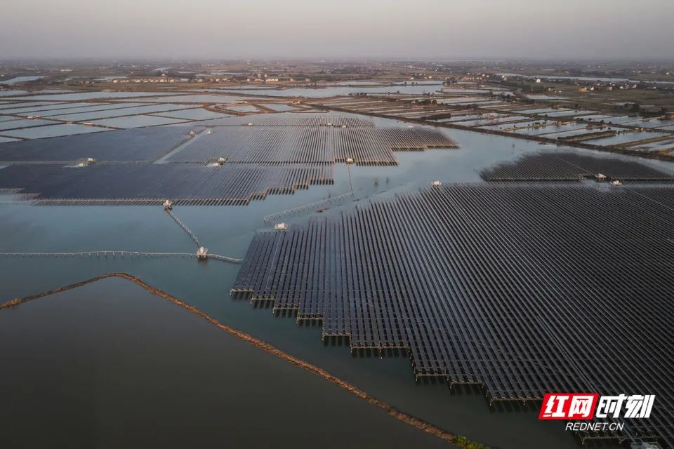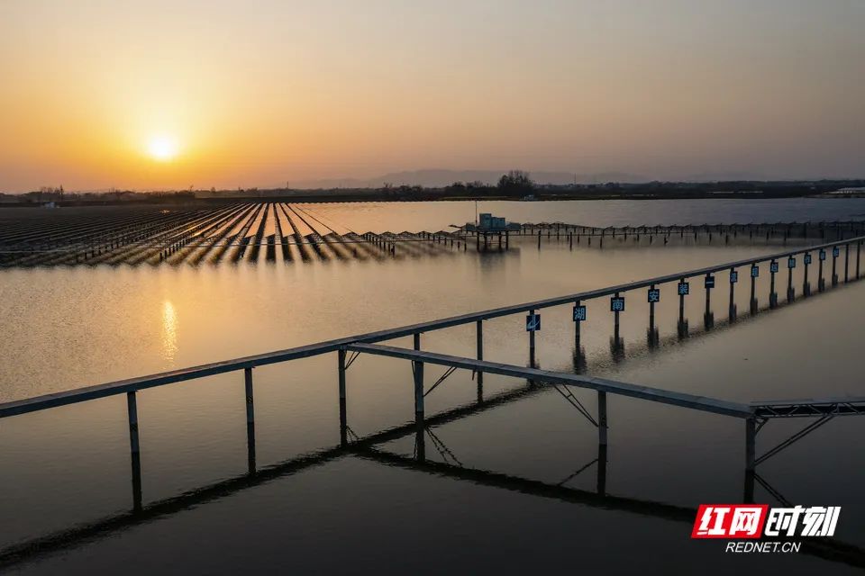 紅網時刻新聞3月9日訊(記者 張興莎 任曄 徐士潔)3月8日下午,當航拍鏡頭從百米高空掃過常德鼎城區(qū)土硝垸3000畝的湖面,“漁光互補”光伏發(fā)電項目在夕陽下熠熠生輝。