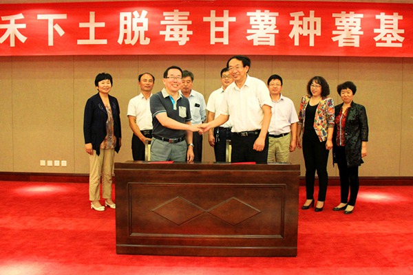 2015年9月24日在"2015年禾下土脫毒甘薯種薯基地觀摩會(huì)"召開期間,《邯鄲市禾下土種業(yè)有限公司與中國農(nóng)科院甘薯研究所所企合作框架協(xié)議》簽約儀式在磁縣溢泉湖嵩景樓國際會(huì)議中心隆重舉行。邯鄲市禾下土種業(yè)有限公司總經(jīng)理崔伏喜與徐州市農(nóng)科院副院長(zhǎng)李強(qiáng)分別代表雙方簽署《所企合作框架協(xié)議》。國家甘薯產(chǎn)業(yè)技術(shù)研發(fā)中心綜合實(shí)驗(yàn)室主任、崗位科學(xué)家李洪民研究員、國家甘薯產(chǎn)業(yè)技術(shù)體系崗位科學(xué)家、河南省農(nóng)科院植保所所長(zhǎng)張振臣、國家甘薯產(chǎn)業(yè)技術(shù)體系石家莊綜合試驗(yàn)站站長(zhǎng)、崗位科學(xué)家張松樹研究員、河南省商丘市農(nóng)科院副院長(zhǎng)楊愛梅研究員出席簽字儀式。