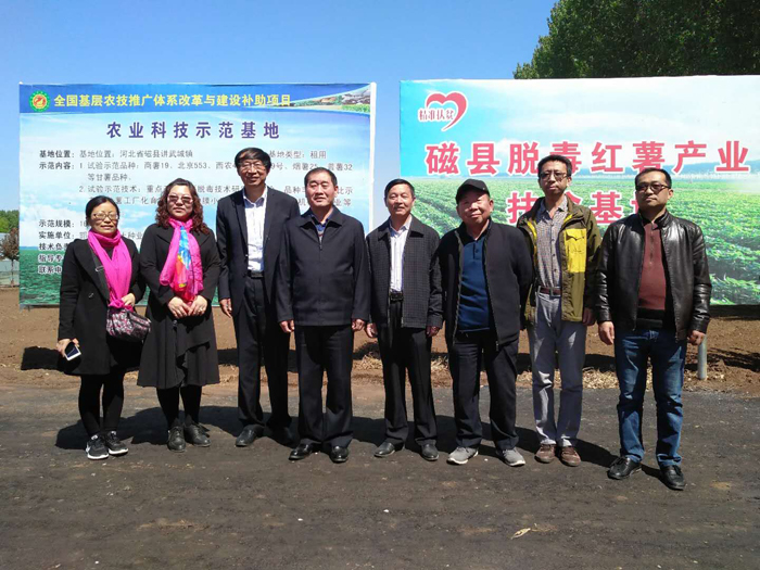 2019年4月14日,原河北省農(nóng)業(yè)廳正廳級(jí)巡視員張文軍、河北省農(nóng)業(yè)產(chǎn)業(yè)協(xié)會(huì)會(huì)長(zhǎng)孫悅明、河北省農(nóng)業(yè)產(chǎn)業(yè)協(xié)會(huì)書(shū)記、常務(wù)副會(huì)長(zhǎng)莊偉、河北省農(nóng)業(yè)產(chǎn)業(yè)協(xié)會(huì)常務(wù)副會(huì)長(zhǎng)、秘書(shū)長(zhǎng)聶永生、河北省農(nóng)業(yè)產(chǎn)業(yè)協(xié)會(huì)駐會(huì)副會(huì)長(zhǎng)張立學(xué)、河北省農(nóng)業(yè)產(chǎn)業(yè)協(xié)會(huì)組織發(fā)展部部長(zhǎng)鄭雪明等一行7人到禾下土脫毒甘薯種苗產(chǎn)業(yè)基地進(jìn)行調(diào)研。邯鄲市禾下土種業(yè)有限公司總經(jīng)理崔伏喜陪同調(diào)研。調(diào)研團(tuán)一行參觀(guān)了脫毒紅薯種苗生產(chǎn)基地,了解脫毒種苗生產(chǎn)流程,一起探討了脫毒甘薯產(chǎn)業(yè)發(fā)展重要性。張文軍專(zhuān)家談到:"甘薯育種是甘薯產(chǎn)業(yè)的"芯片",禾下土脫毒紅薯種苗基地的發(fā)展是在技術(shù)支撐下的產(chǎn)業(yè),甘薯全產(chǎn)業(yè)鏈發(fā)展是穩(wěn)定發(fā)展、提高競(jìng)爭(zhēng)力的關(guān)鍵"。